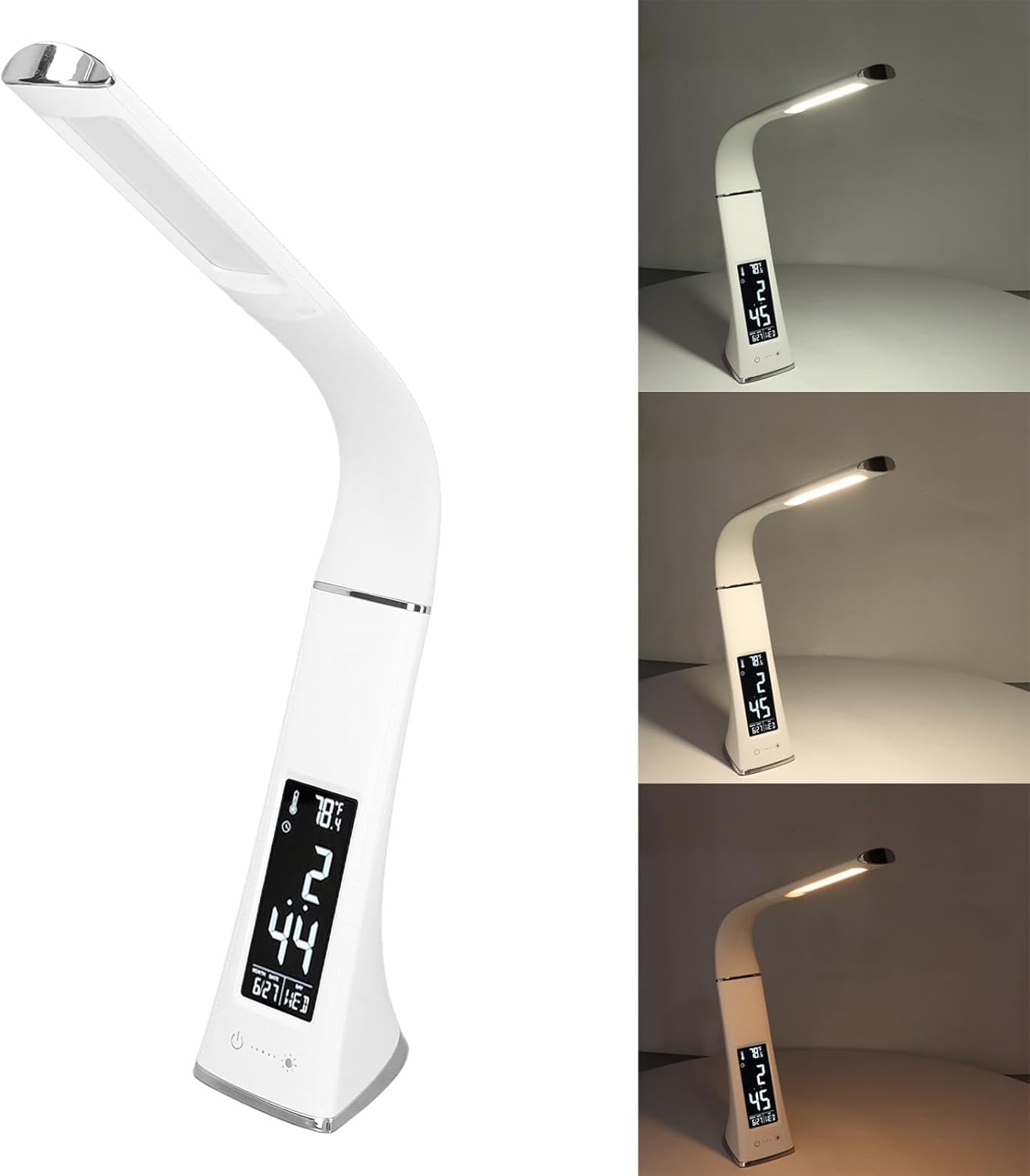 This multifunction LED desk lamp combines eye-care lighting, a digital clock, and temperature and humidity display in one compact design. It is suitable for desks, bedside tables, and office spaces for reading, studying, and daily time management.