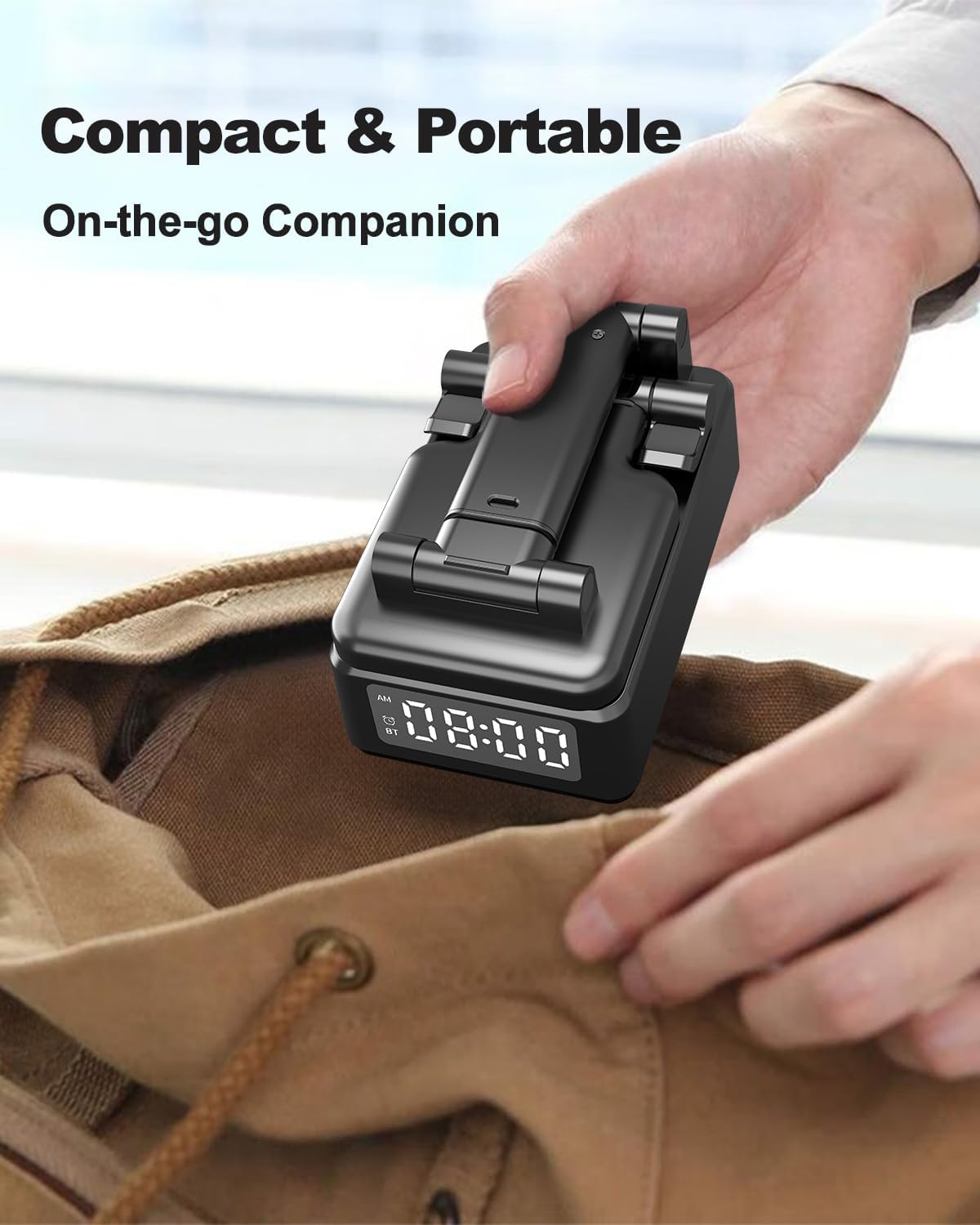 This product is a multifunction wireless charging station that combines a phone stand, Bluetooth speaker, and digital alarm clock in one compact design. The foldable structure makes it suitable for desk use, bedside placement, or travel.