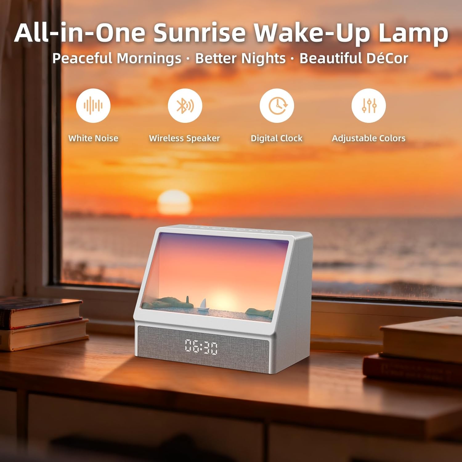 The Luminellen Ocean Sunrise Wake-Up Alarm Clock combines a sunrise simulation, ambient scene lighting, and digital alarm clock into one elegant bedside device. Inspired by peaceful ocean sunrises, it helps you wake up naturally and start your day feeling calm and refreshed.